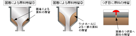 ステンレスタンクによくあるトラブルとして輸送機能に支障をきたすブリッジ現象や、衛生面で問題になるラットホールやブロッキング、タンク内面や配管の破損による原料漏れがあります。設計技術者はこれらを如何に防ぐかが課題になります。